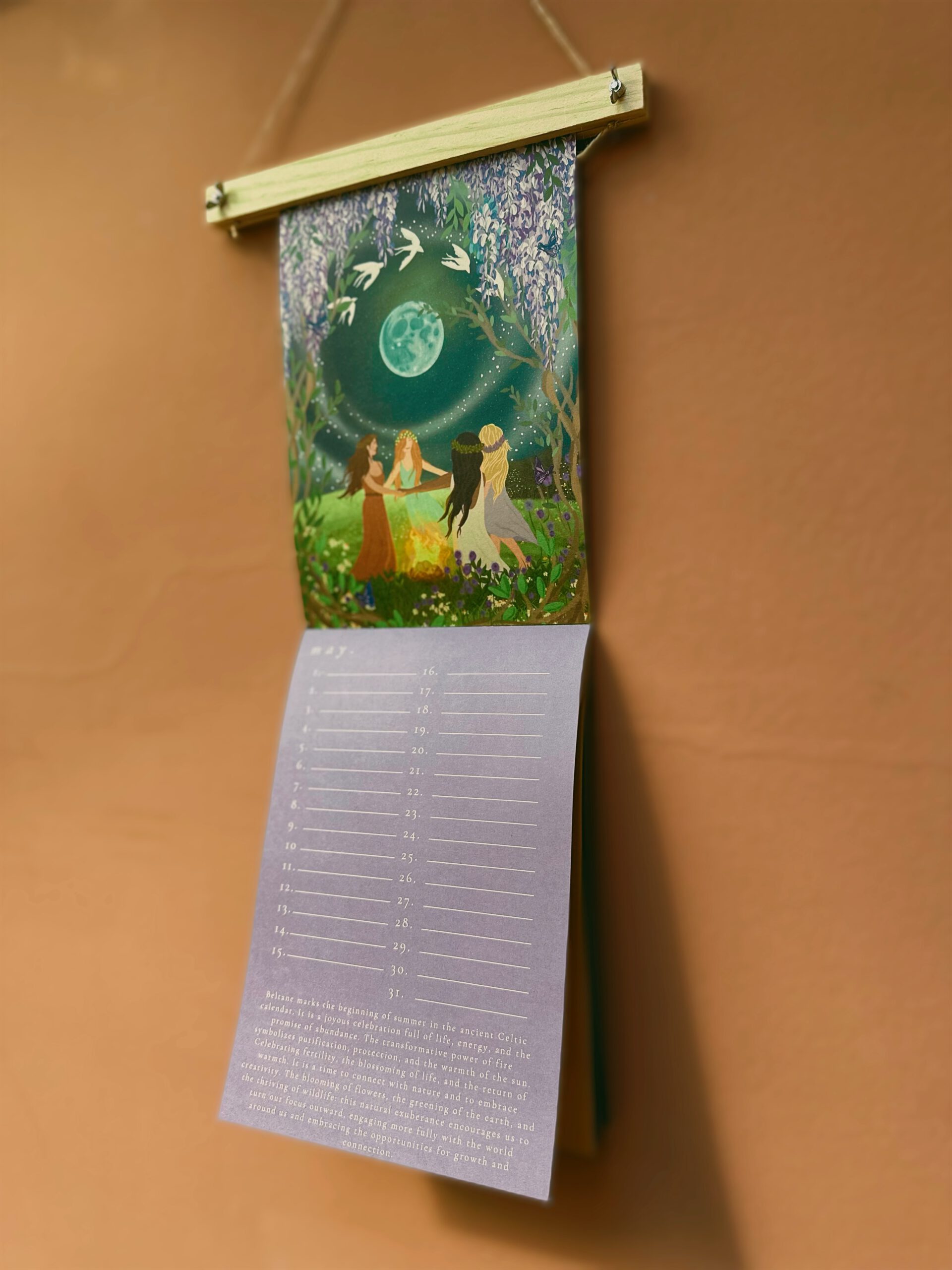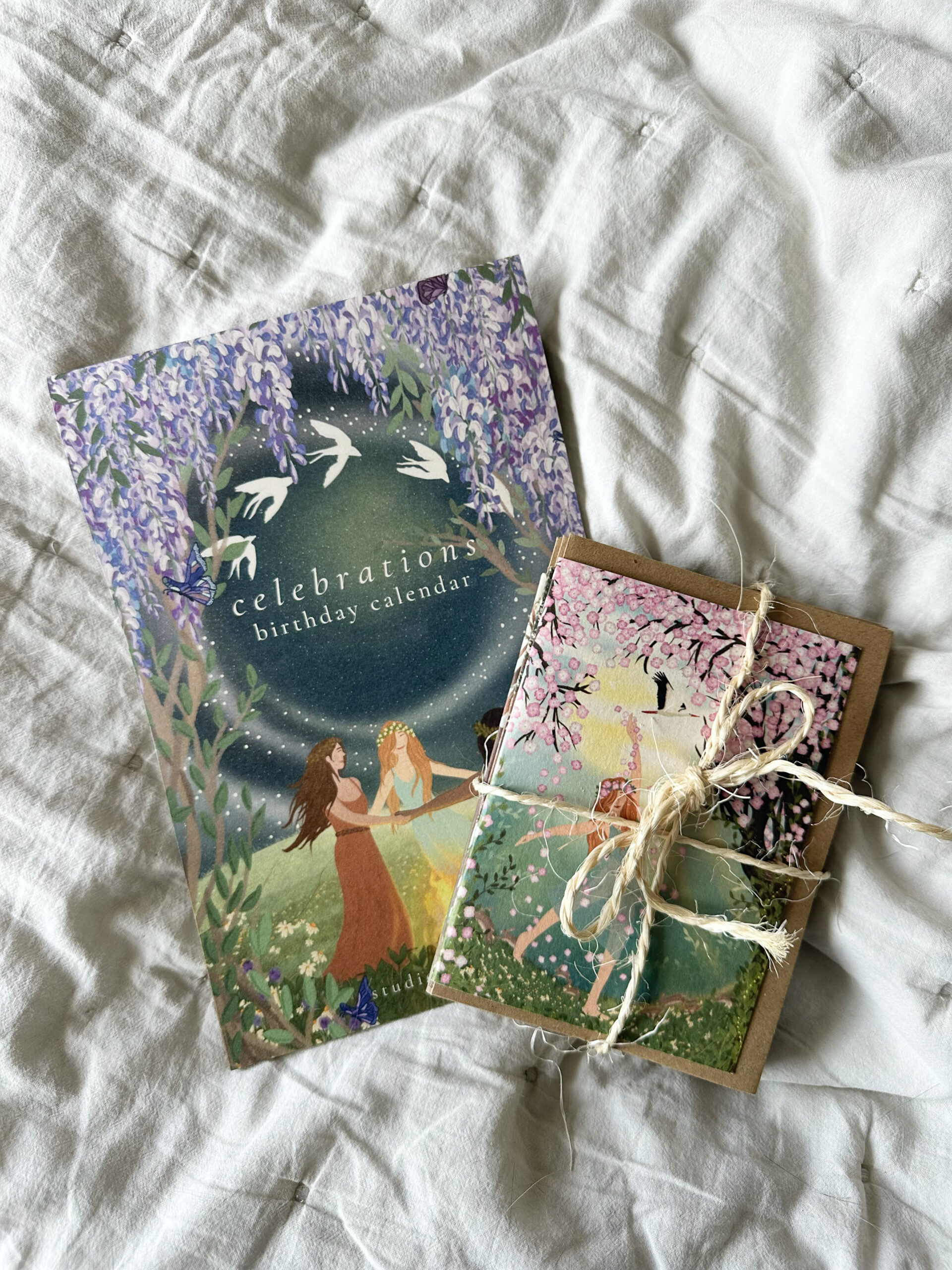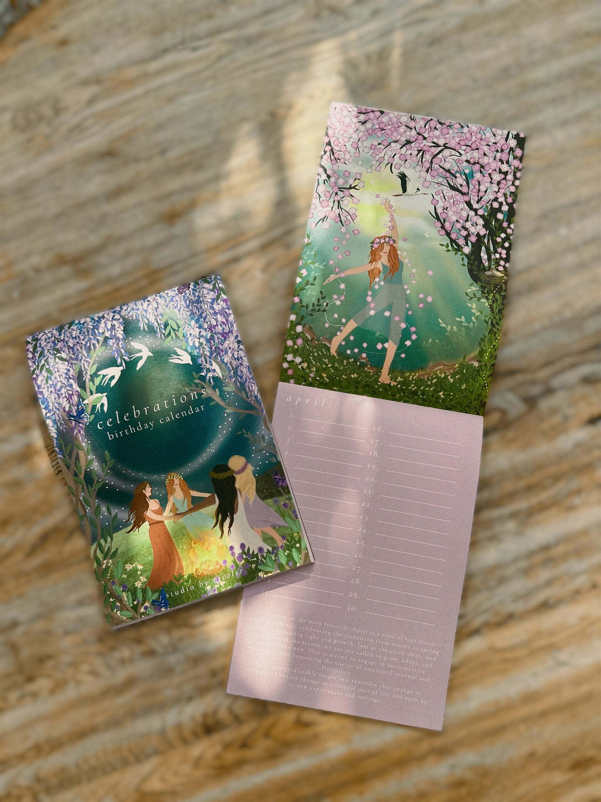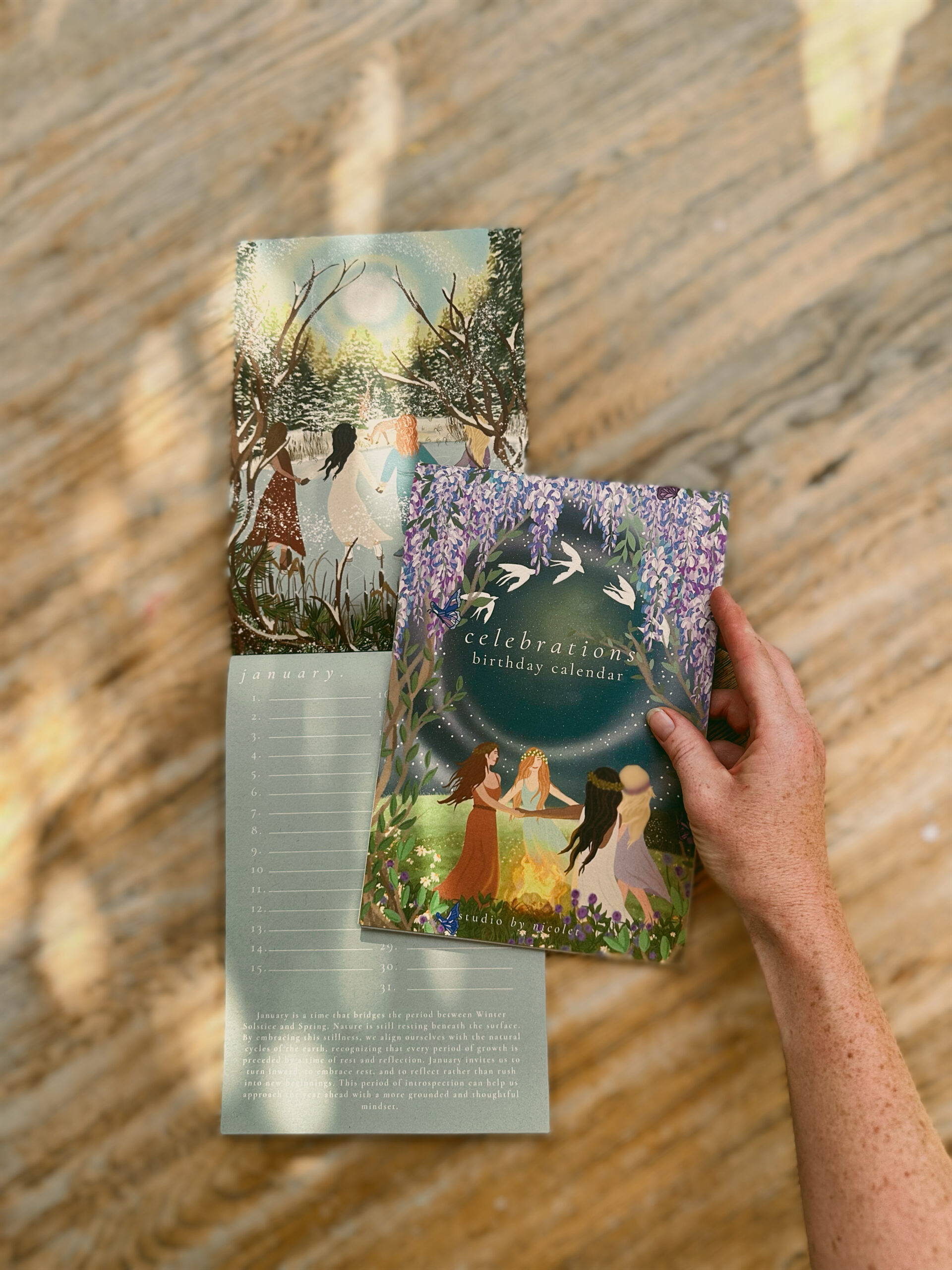 My intent in creating these cards and the calendar, is to share the beauty of ancient practices and the magic they have brought into my life, helping me to live in greater harmony with nature, the seasons, and the cycles of the earth, sun, and moon. These images are inspired by the rich traditions of the Celtic Wheel of the Year and the wisdom of ancient Druids. The teachings, celebrations and inspiration for each month can be found on the back of the postcard.