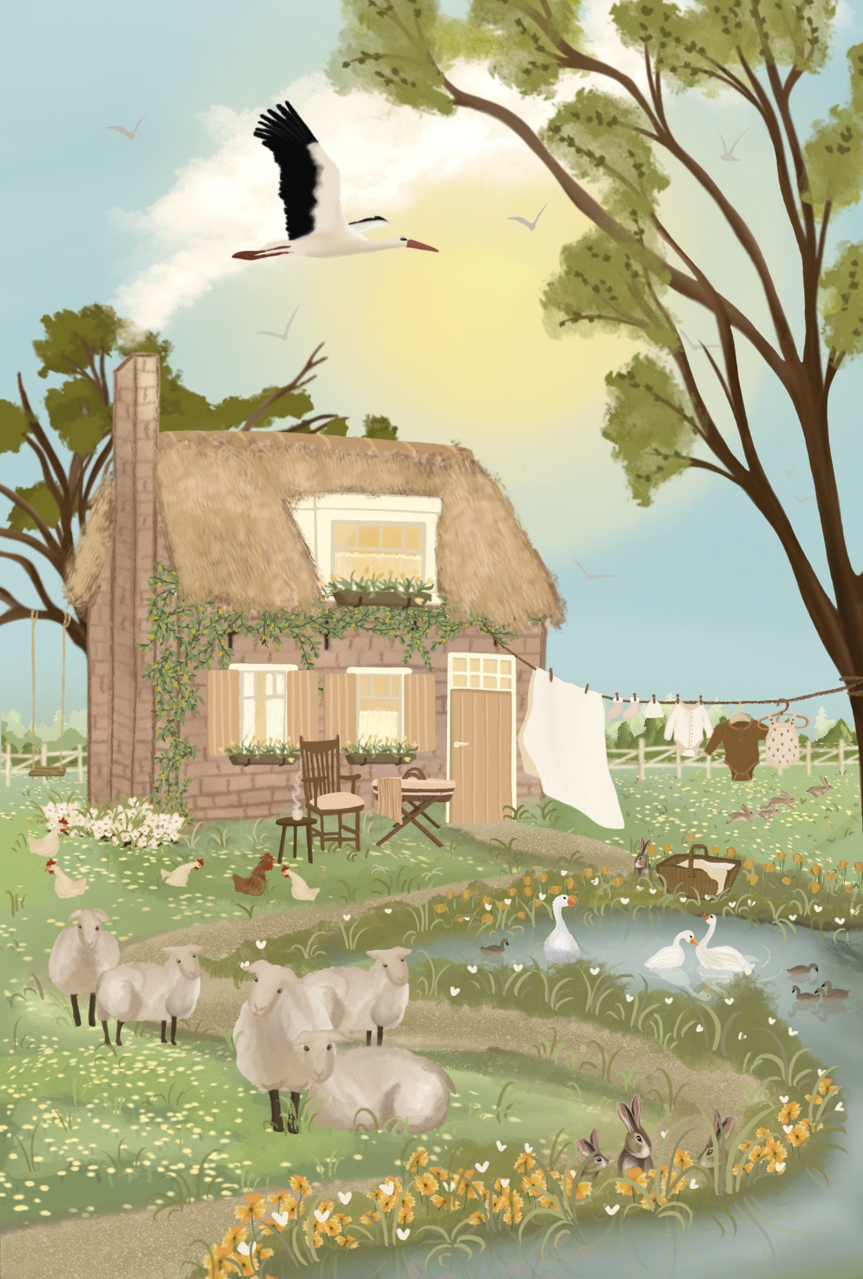 Each card captures a heartwarming scene: a cozy cottage nestled in nature, surrounded by blooming flowers, lush greenery, and gentle animals. The sun casts a warm glow over this peaceful moment, where a tiny cradle and chair invite quiet cuddles—accompanied by a cup of warm coffee (a rare luxury for new parents, I know!).